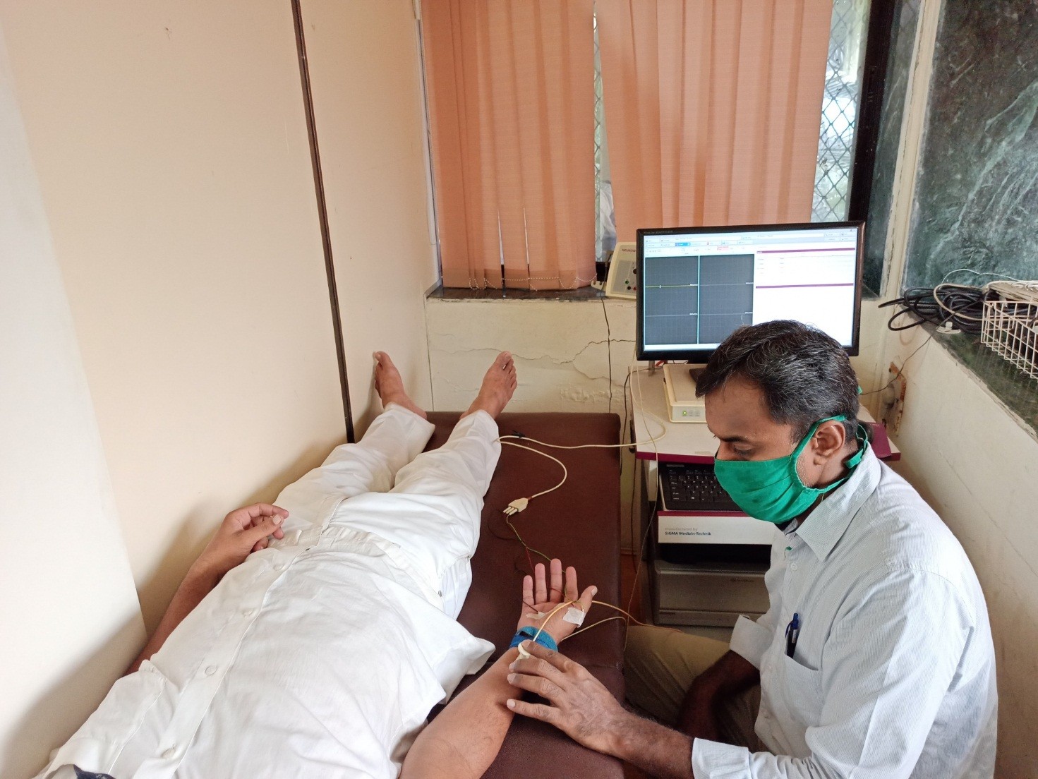 NEUROWERK EMG/NCV devices manufactured by SIGMA Medizin-Technik GmbH, Germany (Fig. 1) were used to assess SSR in this study. SSR was assessed with participants lying supine on a couch in a room maintained at a temperature of 25°C. SSR was assessed by placing disposable surface EMG electrodes on the palm and dorsum of the hand, and the sole and dorsum of the foot. Recordings were obtained with a filter setting comprising a bandpass of 0.5-1000 hertz, a sensitivity of 0.2-0.5 millivolts per division, and a sweep speed of 1 second per division. The stimulus was a short electrical pulse (0.2-millis duration and 15-milliampere intensity) delivered to the median nerve at the right wrist every 60 seconds or longer to avoid habituation. The skin temperature at the test site was 32°C or higher. The test was considered abnormal if no response was detected after at least 10 stimulations. The hand and foot recordings were made sequentially with an interval of 10 minutes between recordings. A well-defined response was selected from 5 consecutive responses and the peak-to-peak amplitude was measured. Abnormal SSR was considered when there was no response or the amplitude was less than 2 SD of the normal mean of Kim, et al. (4).