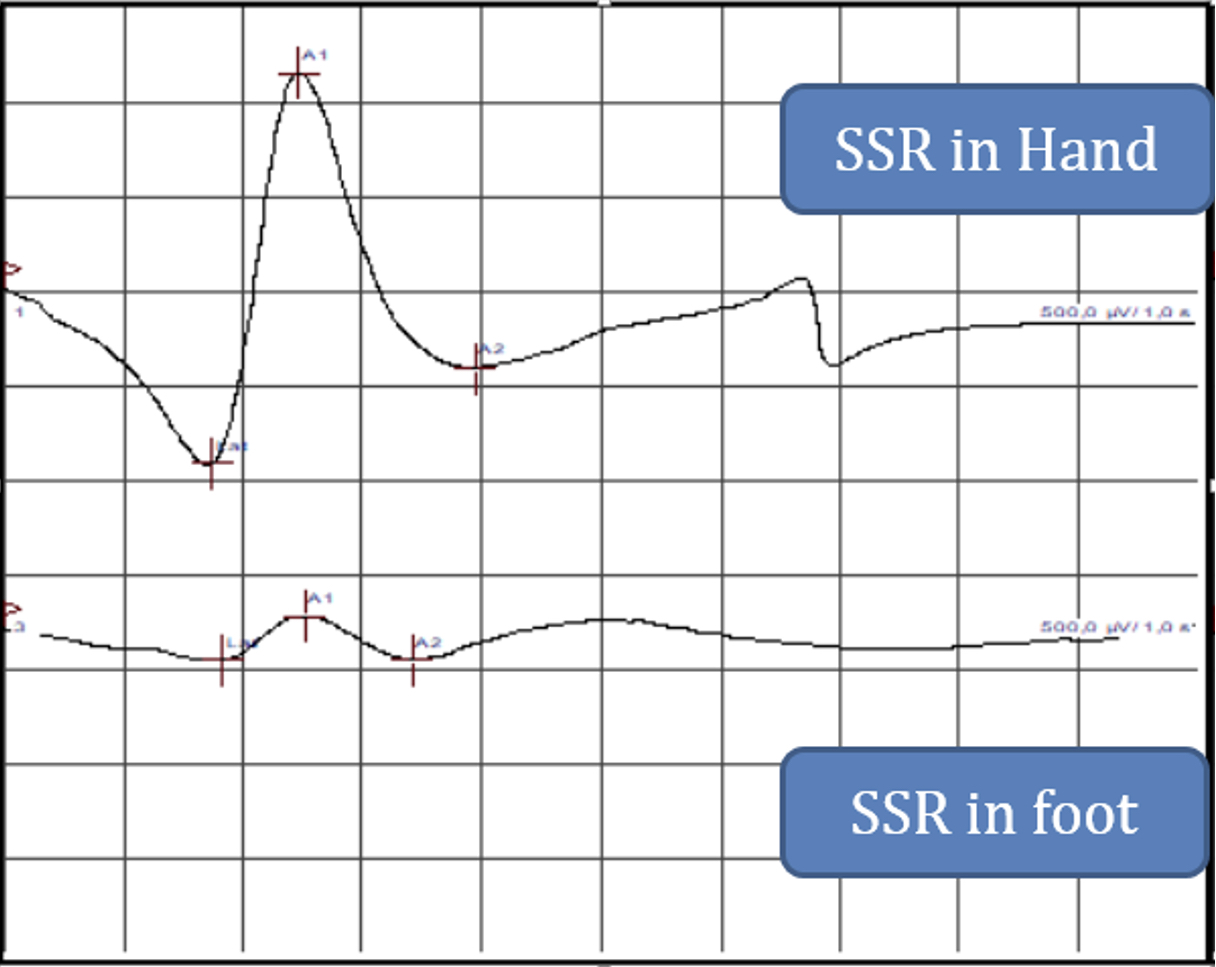 From the results of the study, it can be concluded that the method used in this study is successful in eliciting SSR. The mean SSR latency of hand and foot were 1.2 (+/− 0.42) secs and 1.8 (+/− 0.44) secs, respectively and the mean SSR amplitude of hand and foot were 2503 (+/− 1424) micro volts and 1749 (+/− 1252) micro volts, respectively. Gender had no effect on SSR values assessed in this sample. Also, SSR is not associated with BMI of the participants.