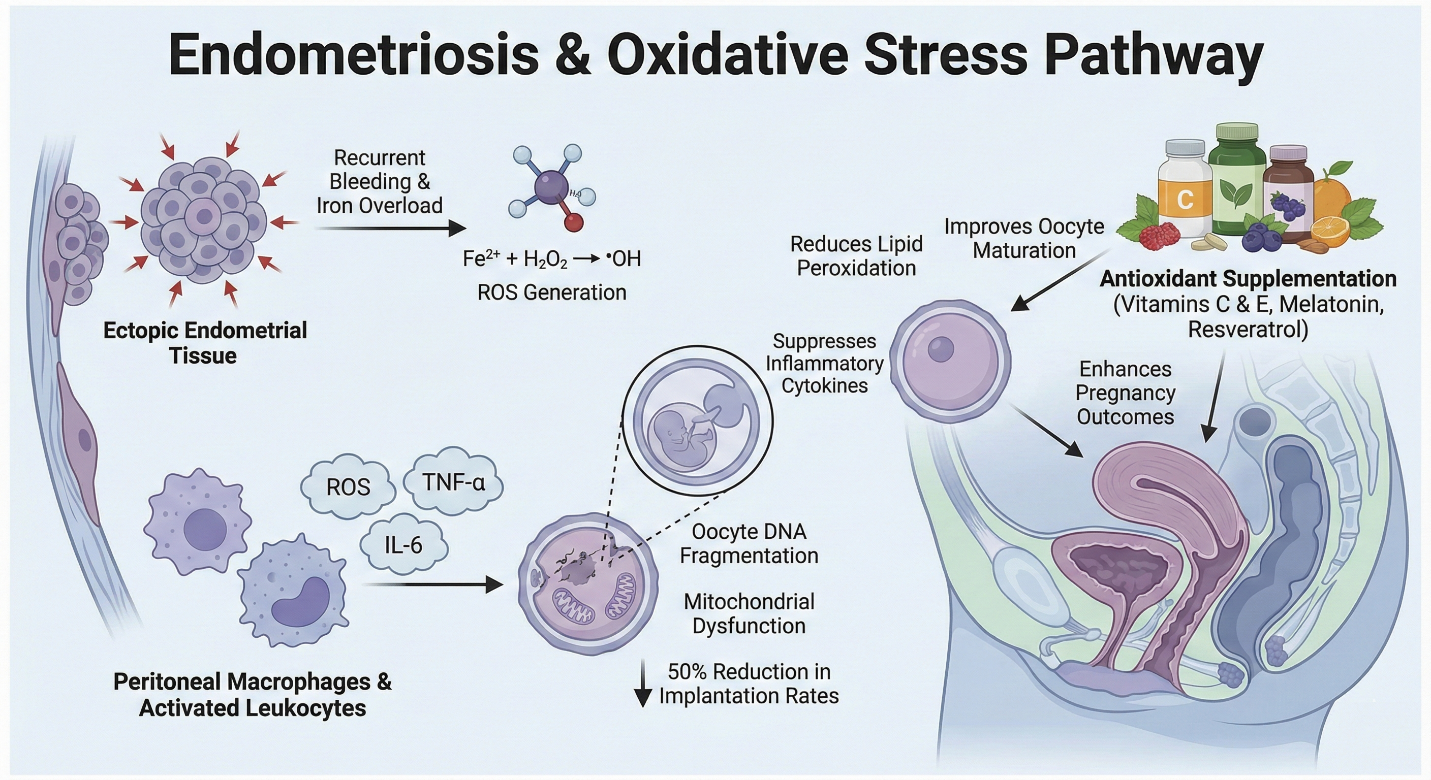 Oxidative stress, characterized by an imbalance between the production of the reactive oxygen species (ROS) and the ability of the antioxidant defense systems. It is crucial to the pathophysiology of infertile women, deleterious impacts through the oocyte maturation, ovulatory functions, associated with reproductive disorders as polycystic ovary syndrome (PCOS) and endometriosis. Mitochondria of oocytes and granulosa cells are the leading sources of ROS whose generation is further worsened by ageing, obesity, as well as environmental assaults. Although physiological levels of ROS are necessary to normal follicular growth and ovulation, excessive levels of ROS cause oocyte DNA breakage, meiotic spindle deregulation, and embryonic in survival. The inherent antioxidant enzymes which as superoxide dismutase (SOD) and glutathione, give the cellular systems partial protection against oxidative damage, however significant and the exogenous antioxidant supplementation such as vitamins C and E, coenzyme Q10, N-acetyl cysteine as well as Melatonin have shown an encouraging result in randomized controlled trials (RCTs) and meta-analyses. Clinical evidence shows that there are better ovarian responsiveness and better oocyte yield and better pregnancy rates in assisted reproductive technologies (ART) especially in women with advanced ovarian age or PCOS. A Cochrane systematic review found a moderate relationship between antioxidant use and increased rates of live births, but the evidence quality was overall low because of the study heterogeneity. Notably, antioxidant interventions were generally well-tolerated and portable with minimal side effects. Future studies ought to focus on more rigorously constructed, high quality, RCTs that are targeted at clinically meaningful end point outcomes like live birth rates as well as consider adjunct parameters of sperm DNA fragmentation, which modifies female reproductive outcomes indirectly. Combination of personalized antioxidant treatment and specific lifestyle changes has a significant therapeutic potential for the female reproductive health and optimizing fertility.