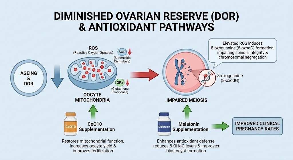 Exogenous antioxidants supplementation replenishes endogenous deficiencies and support oocyte function. N-acetylcysteine (NAC), GSH precursor (1.2-1.8g/day) boosts IVF oocyte yield; melatonin (3-6mg) crosses blood-follicle barrier, reducing 8-OHdG levels by 40%; while Vit C/E (500mg/400IU) synergize antioxidant capacity especially in PCOS ovulation induction (fig 1-3).